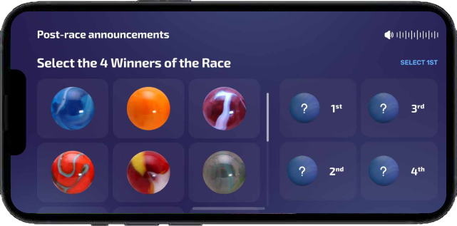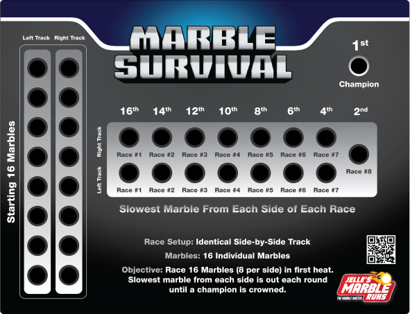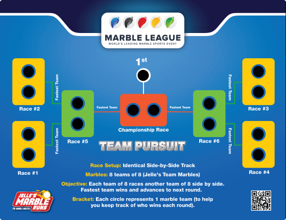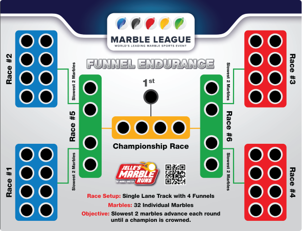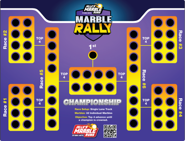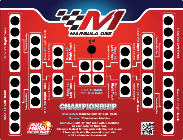 5 Racing Brackets included with every set. These allow you to setup different competitions and keep track of the each marble’s performance by placing them on the interactive bracket.